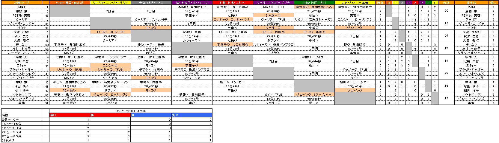 順位 チーム 勝敗 Pt 平均試合時間 1位 大空・秋沢・モトコ組 4勝1敗0分 26pt 21分57秒 2位 ジャガー・クロウ・デブラ組 4勝1敗0分 25pt 21分44秒 3位 MARI・風間・和木坂組 3勝2敗0分 20pt 20分31秒 4位 宇働・七橋・エミィー組 3勝2敗0分 18pt 19分37秒 5位 メイ・ジューン・美龍組 2勝3敗0分 17pt 21分16秒 6位 柳・宇座子・ルシィーワ組 2勝3敗0分 12pt 19分54秒 7位 クーリア・ニンジャ・サタナ組 1勝4敗0分 17pt 24分03秒 8位 中嶋・砂田・相川組 1勝4敗0分 12pt 20分28秒